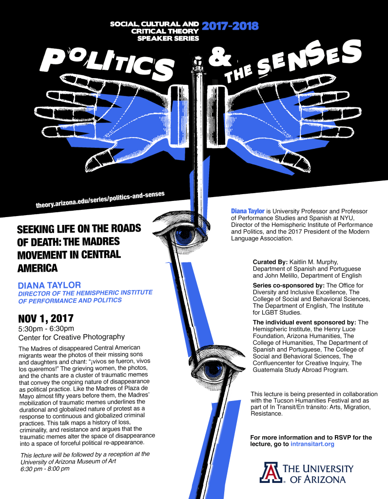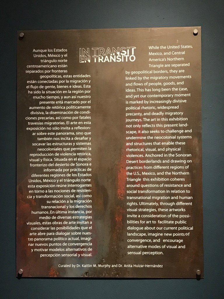 “In Transit/En tránsito” art exhibition at the Museum of Art, symposium, and related events. Co-curated with Anita Huizar-Hernández. Funded by the Hemispheric Institute, The UA College of Humanities, the Tucson Humanities Festival, the UA Department of Spanish and Portuguese, Luce Family Foundation, UA Museum of Art, UA Confluence Center, UA College of Social and Behavioral Sciences, UA Latin American Studies, and CALA Alliance. September 16, 2017-March 11, 2018.