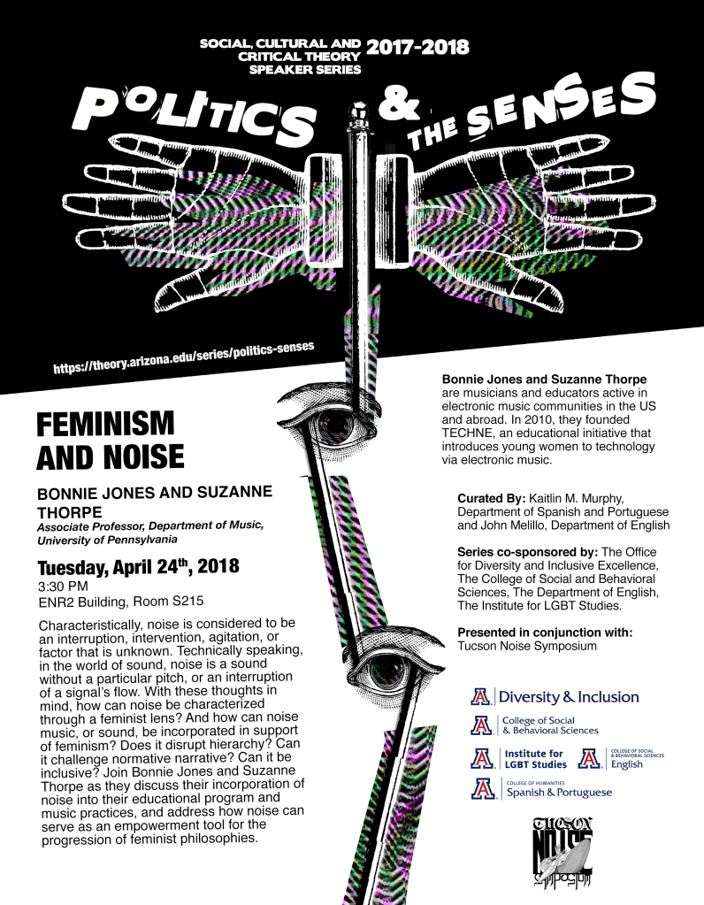 “The Politics and the Senses” 2017-2018 speaker series. Co-curated with John Melillo. Funded by The UA Social, Cultural, and Critical Theory Graduate Interdisciplinary Program, Diversity and Inclusion, College of Social and Behavioral Sciences, Institute for LGBT Studies, Department of English, Department of Spanish and Portuguese, Fred Fox School of Music, American Indian Studies, College of Humanities, Poetry Center. October 18, 2017-April 24, 2018.