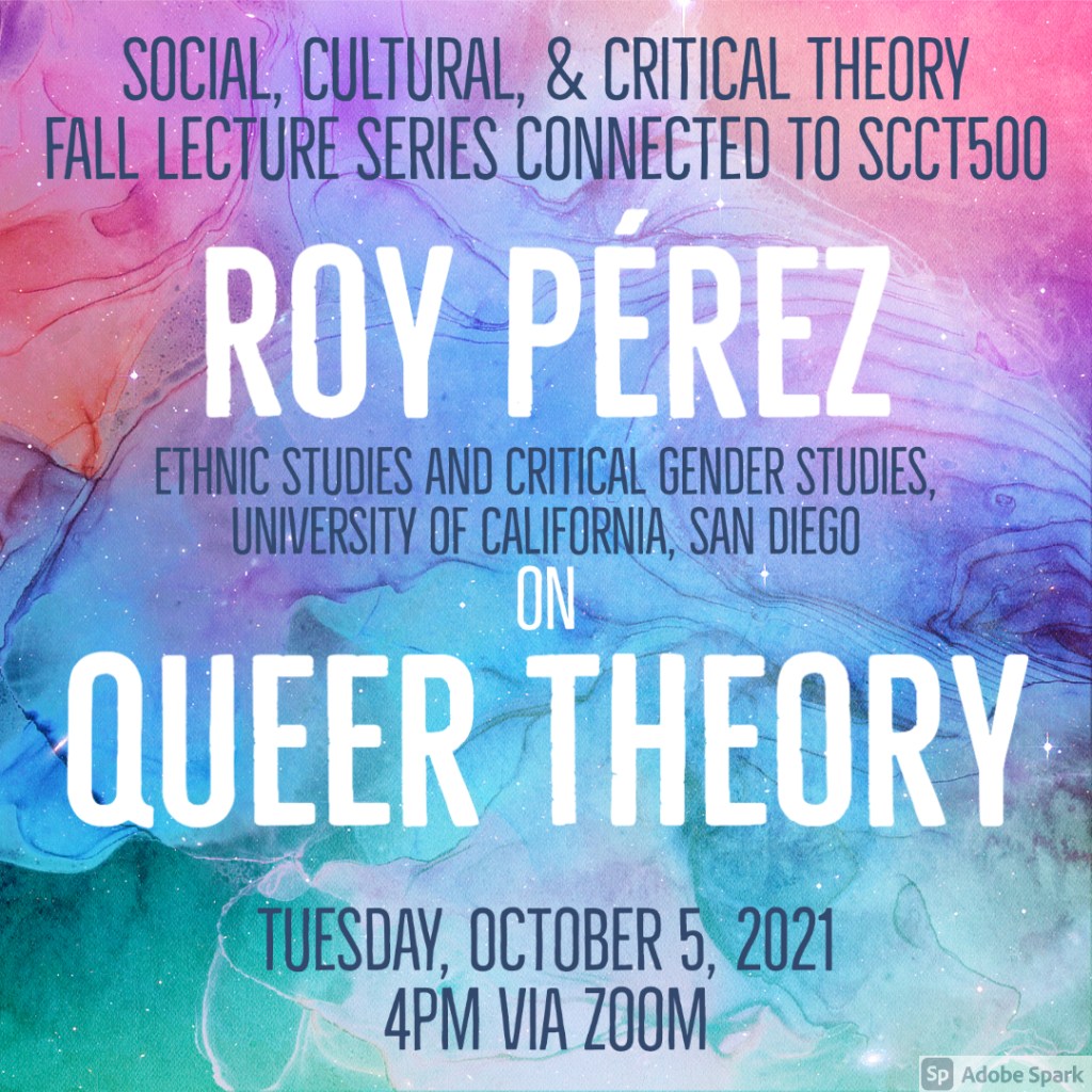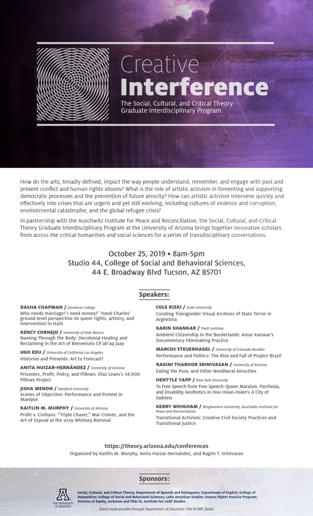 “Creative Interference” symposium. Co-curated with Anita Huizar-Hernández and Ragini Tharoor Srinivasan. Funded by the UA Social, Cultural, and Creative Interference Graduate Interdisciplinary Program, the Department of Spanish and Portuguese, Department of English, College of Humanities, College of Social and Behavioral Sciences, Latin American Studies, Human Rights Practice Program, Division of Equity, Inclusion and Title XI, and Institute for LGBT Studies. October 24-25, 2019.