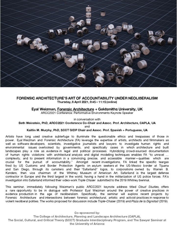 “Forensic Architecture’s Art of Accountability Under Neoliberalism.” In conversation with Eyal Weizman and Beth Weinstein. Architectural Research Centers Consortium (ARCC) Conference, University of Arizona, April 8, 2021.